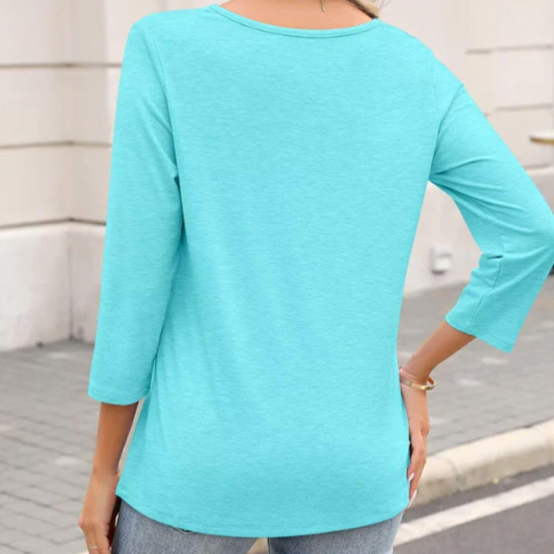 Einfarbiges Oberteil mit 3/4-Ärmeln und V-Ausschnitt für Damen