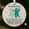 Het heldere witte ronde oppervlak toont twee levendige turquoise vrouwensilhouetten die hand in hand dansen, een moment van pure vreugde en verbondenheid vereeuwigend. Boven hen springt de titel "The Bitches Times" er speels en zelfverzekerd uit, terwijl de omringende tekst het tafereel omhult met een hartelijke hulde: "Op Naar Weer Een Jaar Vol Eigen Gags Uitlachen, Met Moeilijke Mensen Omgaan & Elkaar Bij Onze Zinnen Houden!"