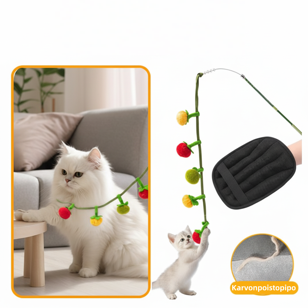 STIMULEREND ONTWERP MET KATTENKRUID - Deze speelstok bevat charmante kleine kaki's en tomaatjes, ontworpen om de aandacht van je kat te trekken. Elk stuk bevat een subtiele hint kattenkruid, dat katten van nature uitnodigt om te bijten, te stampen en met het speelgoed te slaan. Kattenkruid stimuleert hun natuurlijke jachtinstincten, waardoor speeltijd verandert in een actieve en verrijkende ervaring die je kat langer vermaakt.