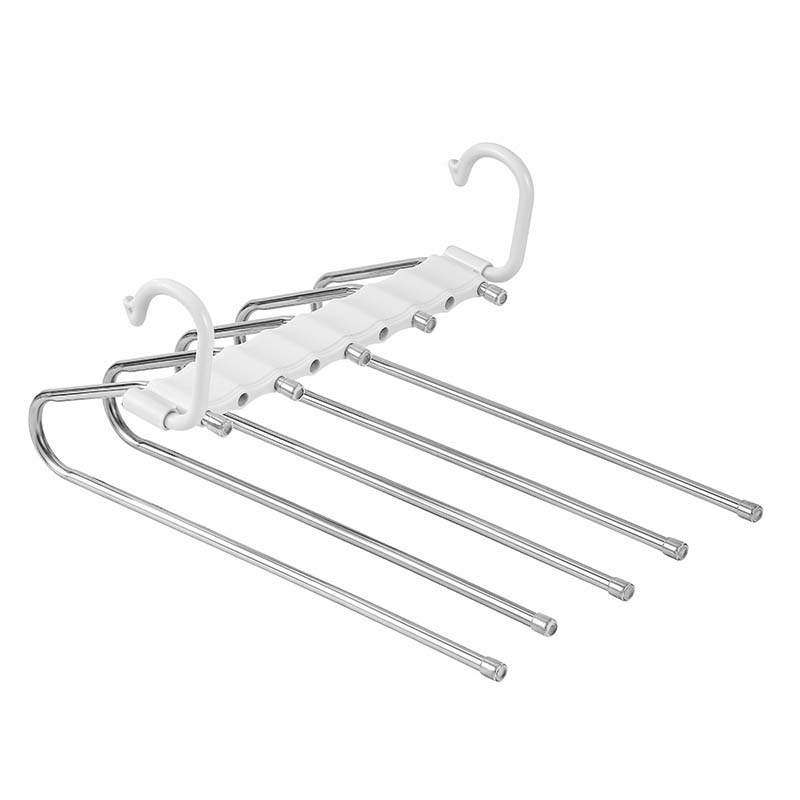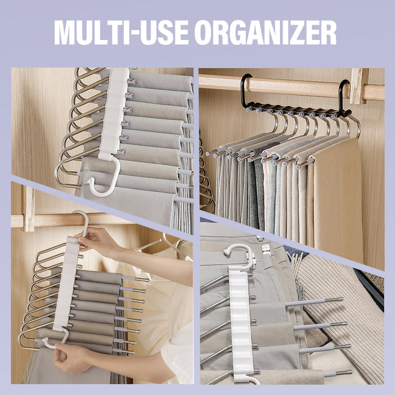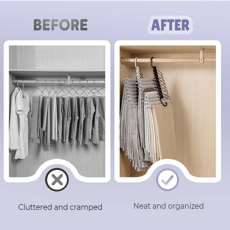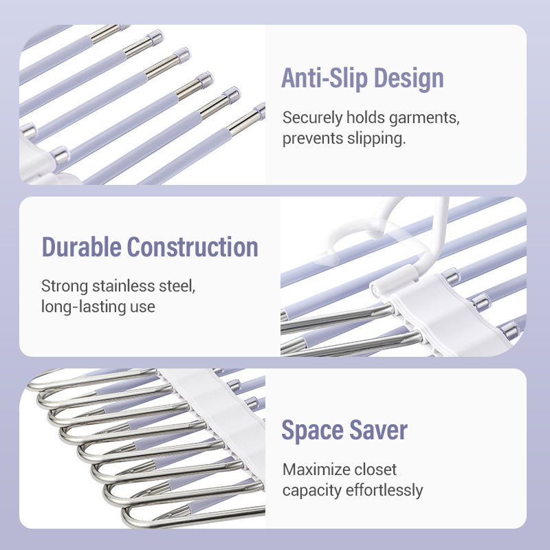 OPTIMAAL RUIMTEGEBRUIK: Ontworpen om meerdere kledingstukken te houden, bespaart deze hanger zowel verticale als horizontale ruimte. Hij organiseert meerdere items netjes aan één hanger, vermindert rommel en maximaliseert de kastcapaciteit efficiënt.
